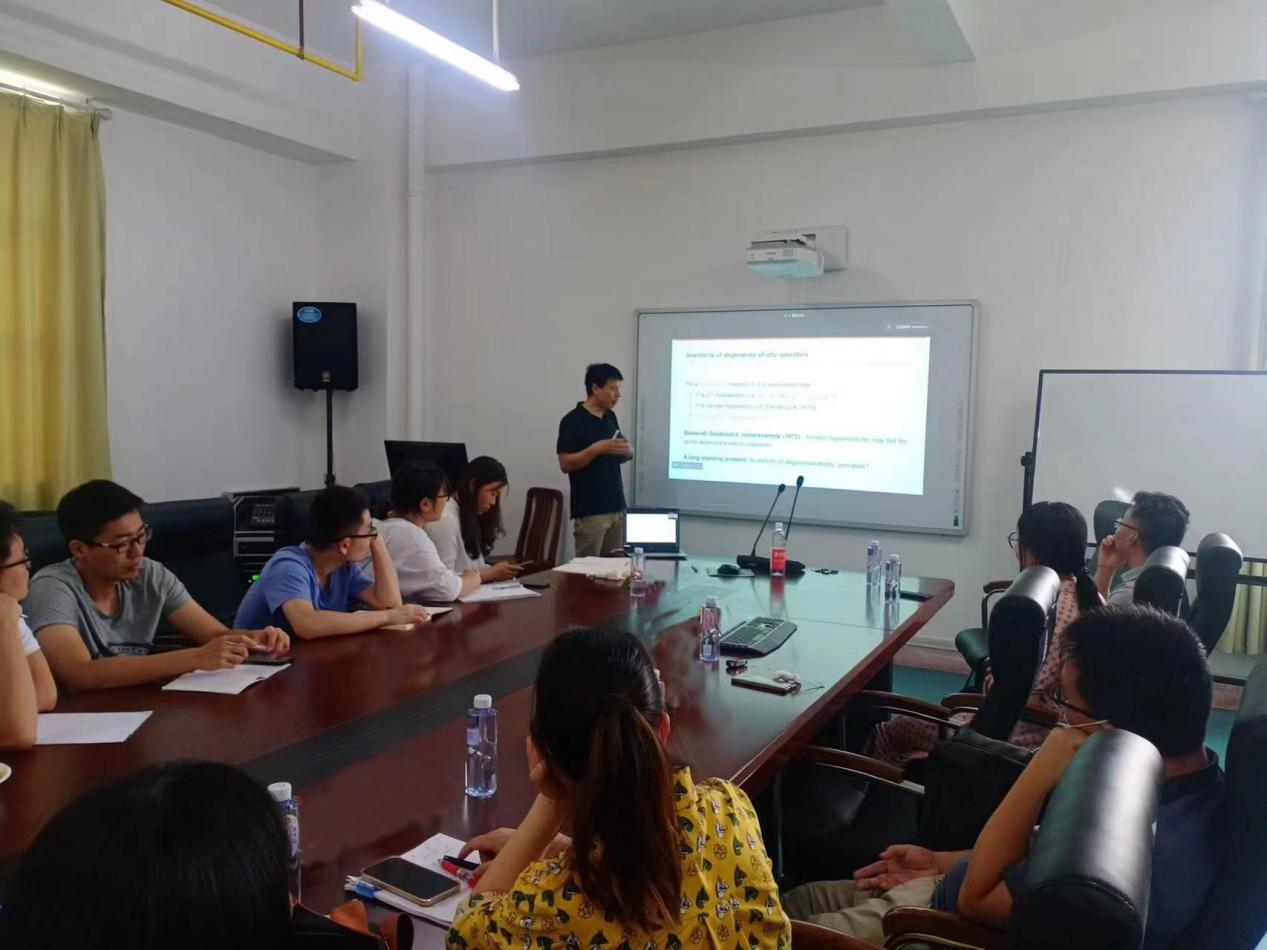 李维喜教授报告的题目为“Analytic smoothing effect of the spatially inhomogeneous Landau equations for hard potentials ”,主要介绍了非齐次 Landau 方程小性假设下光滑解的存在性和低正则性弱解的存在性结果。李维喜教授介绍了用傅里叶变换求Fokker-Planck算子的相关技巧,Landau 方程与Fokker-Planck算子不同的地方就是需要用能量方法去处理碰撞项,最后获得了光滑解的存在性,并介绍了低正则性弱解的存在性结果。