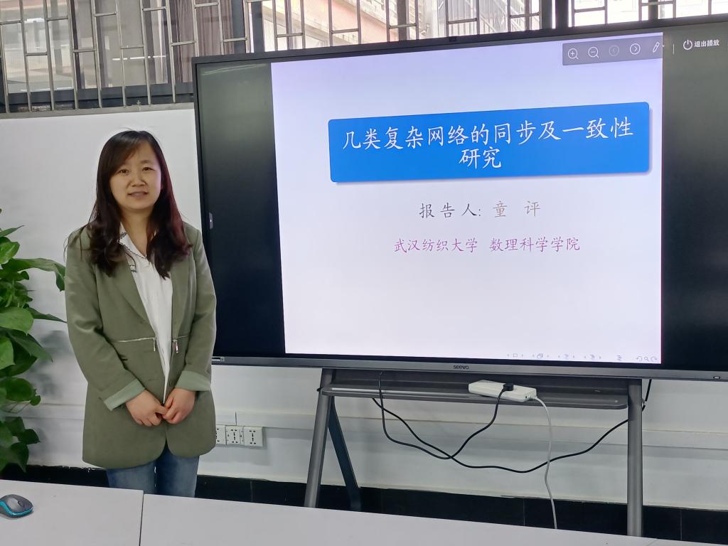 童评老师进行了题为“几类复杂网络的同步及一致性研究”的报告。报告介绍了复杂网络同步和一致研究的背景,应用图论、矩阵理论和稳定性理论,首先研究了个体动力学不满足QUAD条件的复杂网络的指数同步问题,并将文章提出的方法用于经典模型,最后进行了数值仿真说明理论的有效性,其次研究了耦合拓扑结构是连续时变的多智能体系统的有限时间一致,给出了达到一致的最小时间估计,并把提出的一致算法用于固定拓扑结构和切换拓扑结构,最后进行了数值仿真说明方法的有效性。