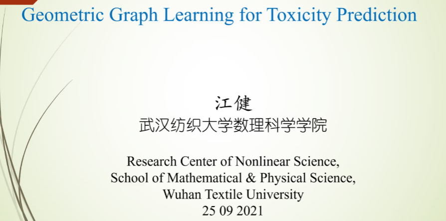2021年9月25日,由华中科技大学电气与电子工程公司举办“武汉地区复杂系统研讨会”在线上成功举办。15vip太阳集团江健博士应邀参会并做报告,报告题目为:Geometric graph learning for toxicity prediction。本次会议紧紧围绕生物物理、生物信息和复杂系统动力学为主题展开研讨。来自华中科技大学、武汉大学、中国地质大学、华中师范大学、太阳集团等武汉地区的各大高校、科研院所相关领域专家近百人参会,共有20多位报告人作大会报告。