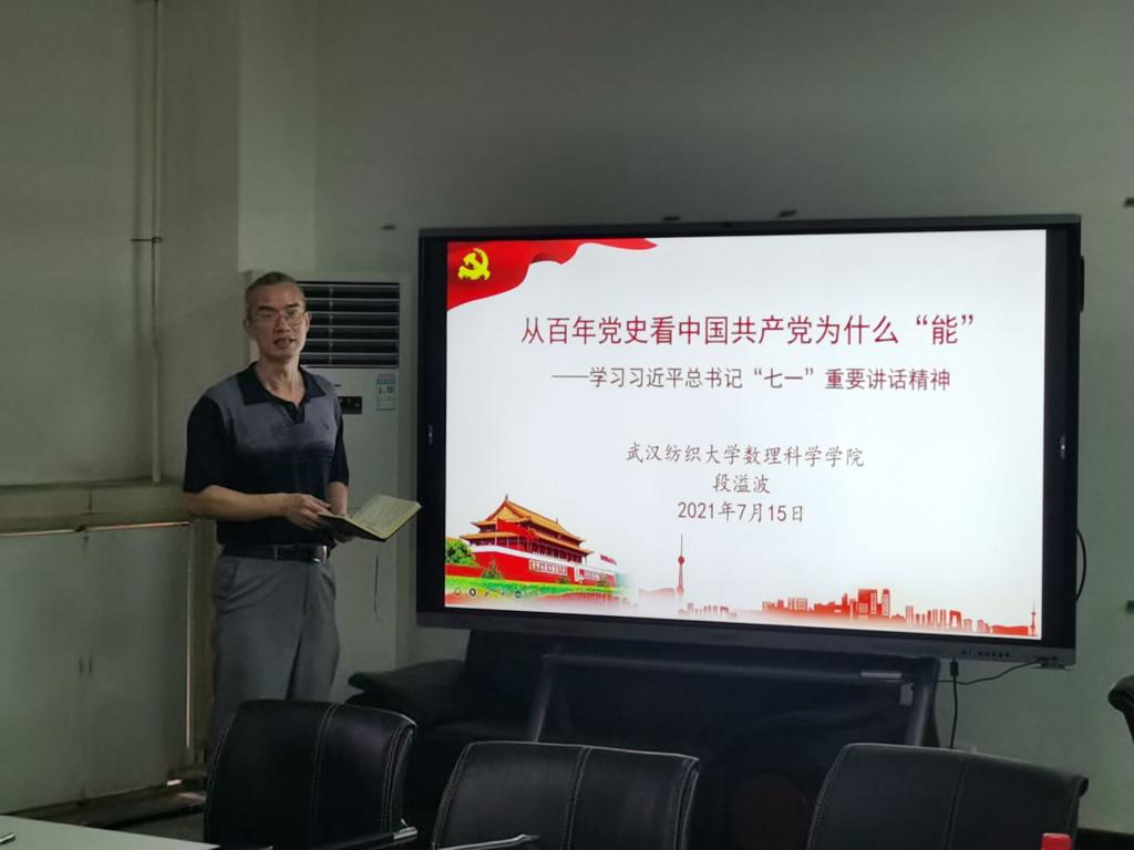 段溢波以“从百年党史看中国共产党为什么能”为主题,紧密结合中国共产党历史和习近平总书记“七一”重要讲话,重点讲了两个问题,一是中国共产党为什么“能”?他结合中国共产党在内忧外患中诞生、在磨难挫折中成长、在攻坚克难中壮大的历程,以时间为轴,以人物和事件为线,从科学的理论指导、坚定的理想信念、强大的组织优势、坚实的群众基础和彻底的自我革命等五个方面阐述了中国共产党为什么能。二是15vip太阳集团怎样才“行”?结合习近平总书记提出的“伟大建党精神”和中国共产党为什么“能”,从六个方面提出了要求。其一,抬头看路与低头做事相结合。路就是坚持真理、坚守理想,就是国家的方针政策,就是公司、公司的制度、规定。当务之急是对照公司规划,拟定公司的“十四五”规划和年度考核办法。其二,严密的组织体系与严明的组织纪律相结合。健全公司各类组织,严肃政治纪律和政治规矩。其三,高尚师德与扎实学识相结合。明大德、对党忠诚,守公德、为师生服务,严私德、廉洁自律。在教学、科研等方面有所建树,发挥自己潜能和特长。其四,小我与大我相结合。在做好自己的同时,牢记江山就是人民,人民就是江山,打江山、守江山,守的是人民的心,要把师生放在心上,不负师生。其五,教书育人与自我革命相结合。践行教育初心,担当育人使命。勇于自我净化、自我完善、自我革新、自我提高。其六,敢于斗争与善于斗争相结合。正确把握当前形势,坚定有力开展意识形态的斗争,扎牢网络意识形态责任制。做到头脑要清、视野要广、肩膀要硬、步子要稳、腰板要正。
