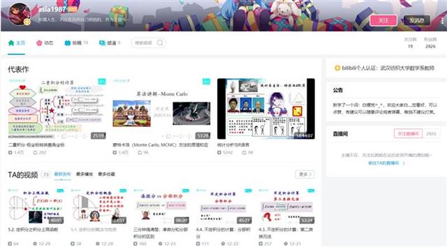 33岁的时亚洲成为B站知识类up主的契机,是今年疫情期间的“停课不停学”。此前,专注学术研究的他根本不知道什么是B站。“我向员工做调查,问他们想在什么平台上课,他们选了B站,我也因此打开了新世界的大门。”时亚洲说,B站开课以来,员工们教他怎么做有吸引力的封面、怎么用网络化的表达让课程更活泼,他总是“从善如流”,“你看,我的课件里,有动漫角色PK,有各种表情包,连视频水印,都是由高数符号组成的一张动漫脸。”