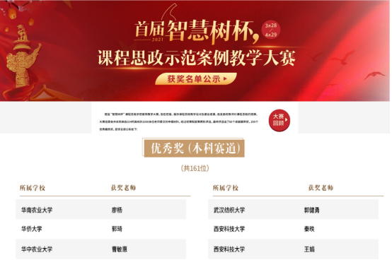首届“智慧树”杯课程思政示范案例教学大赛旨在深入贯彻习近平总书记关于教育的重要论述和全国教育大会精神,贯彻落实教育部《高等公司课程思政建设指导纲要》,挖掘、展示在线课程及混合式课程的课程思政教学设计及建设成果,共吸引了来自全国354所高校1000余位老师的参赛。大赛由东西部高校课程共享联盟运营服务单位智慧树主办,从2021年3月28日开始,经过初赛和复赛,经组委会及专家评审,最终评选出260个获奖案例。