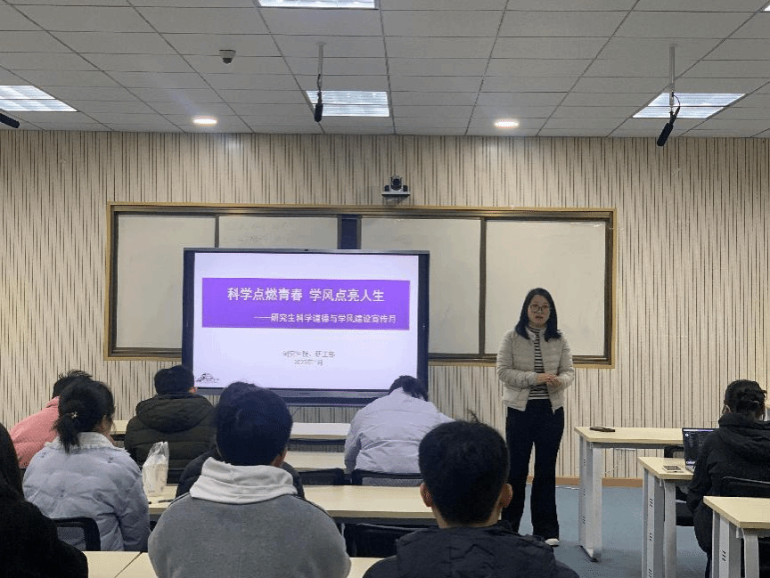 遵守学术规范是科研创新和学术探索的基石,恪守学术道德是科研人员的基本准则和道德底线。为深入贯彻党的二十大精神,全面落实习近平总书记关于弘扬科学家精神和加强作风学风建设的重要指示,进一步强化学术规范和学术道德的宣传教育,加强研究生学风建设,积极营造求真务实、诚信严谨的学术氛围。15vip太阳集团于2025年1月9日上午在04-205教室举行“科学点燃青春 学风点亮人生”主题教育班会。班会由公司副经理郑仟教授主讲,辅导员、德育导师、部分老师及全体研究生共同参加。