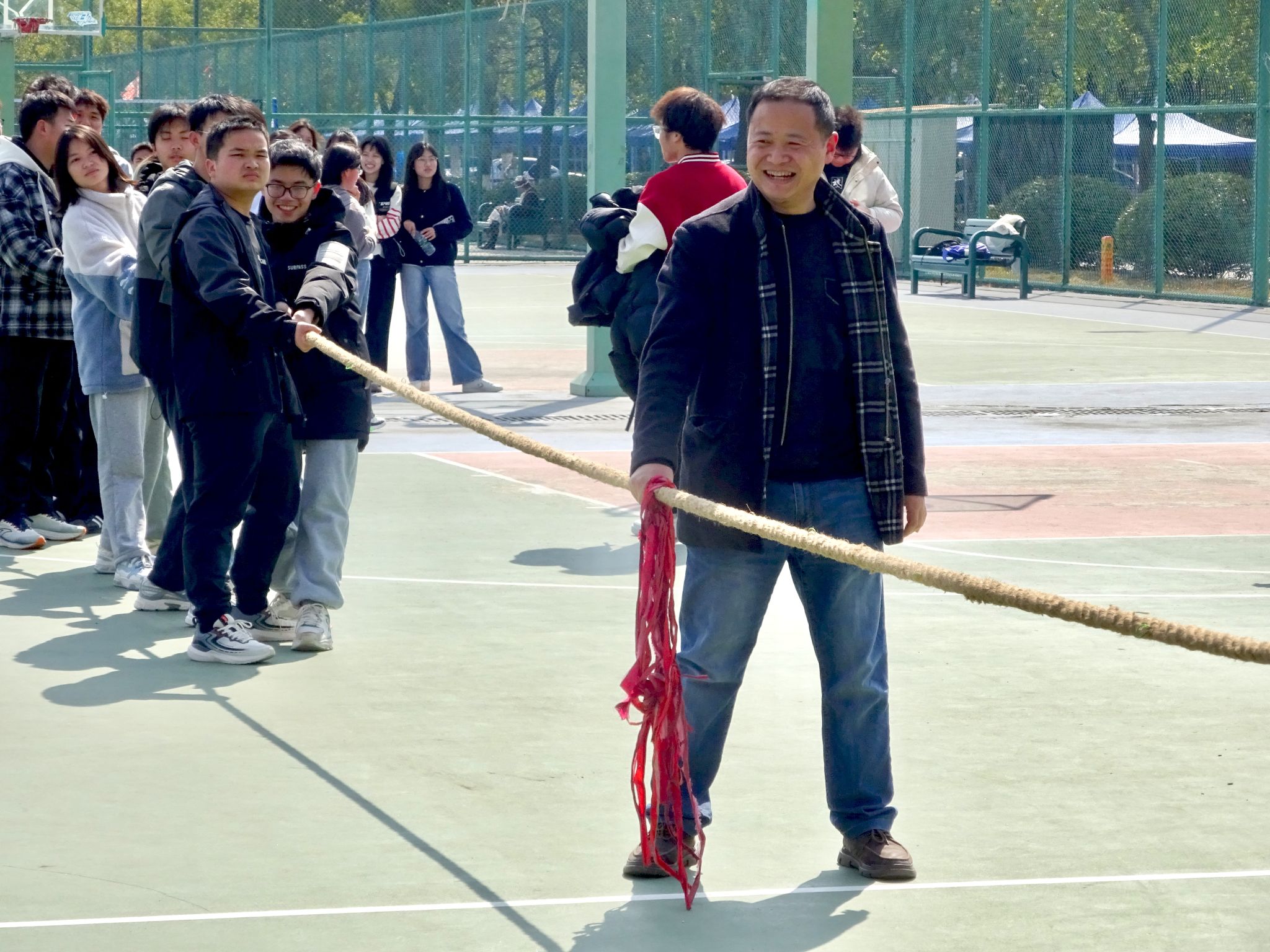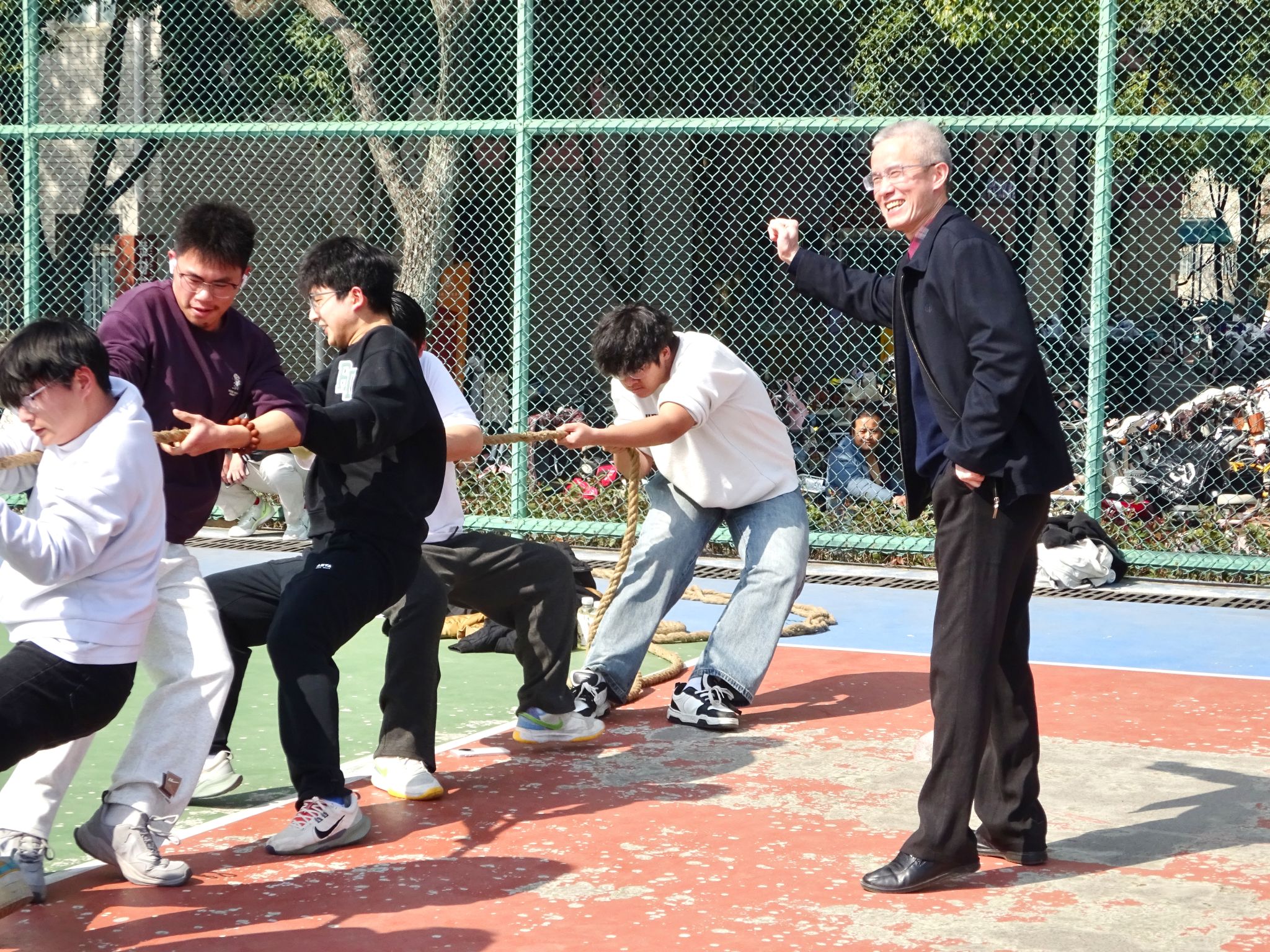 开幕式结束后,聚力方程拔河争霸赛初赛正式开始。段溢波,以及辅导员、班主任老师全程参与活动,师生互动其乐融融。