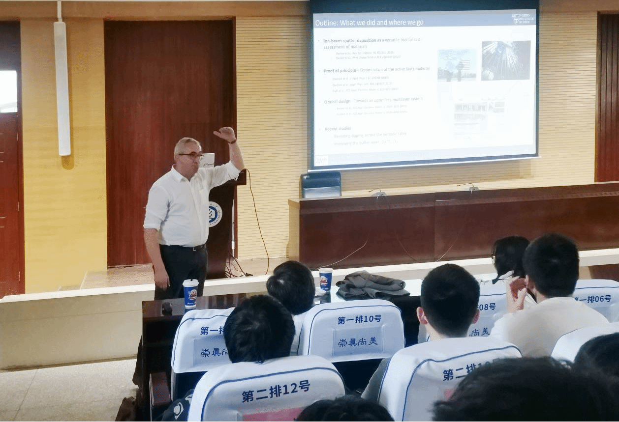 当天下午,Peter J. Klar教授作客第779期“阳光论坛”,在行政楼二楼报告厅作了题为“Steps of optimizing VO2-based multilayer structures for thermochromic smart window applications”的学术报告。报告会由微电子公司何云斌教授主持,数理公司经理汪胜祥教授、微电子公司经理陈长清教授、公司部分青年教师、研究生及本科生参加了此次报告会。