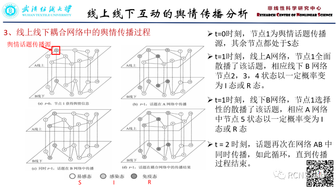 李沁雅分享了一篇名为《基于耦合网络的线上线下互动舆情传播模型研究》的双层网络文章,该文章采用 Price 网络和WS 网络模拟线上线下网络层,通过一定的关系连接设计了传播的耦合网络载体。针对线上辐射传播,线下选择传播的特性以及节点双渠道传播的状态变化规律,构建了线上线下互动舆情传播模型 SIR_2O。实验结果表明,线上线下互动扩大了话题传播的速度和广度,下传率和上传率以及两者乘积都与传播覆盖率呈正相关关系,其联合作用存在传播阈值。