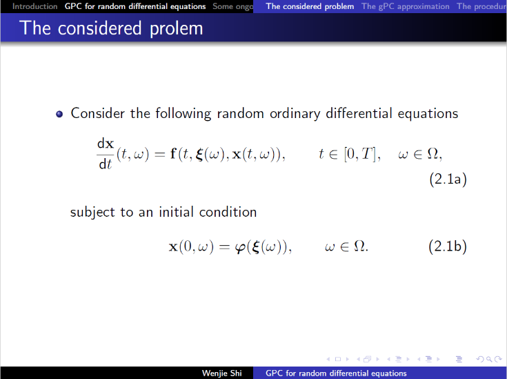 史文杰博士进行了题为“Generalized Polynomial Chaos for Random Differential Equations”的报告。报告介绍了不确定性量化研究领域尤其是 gPC方法的研究背景,讲解了gPC方法求解随机微分方程的一般步骤,包括:gPC逼近原理、gPC方程的导出、以及gPC方程的数值求解等相关问题,并进一步介绍了他目前正在开展的一些相关工作的研究情况。最后,老师们就相关问题进行了充分的交流和讨论。
