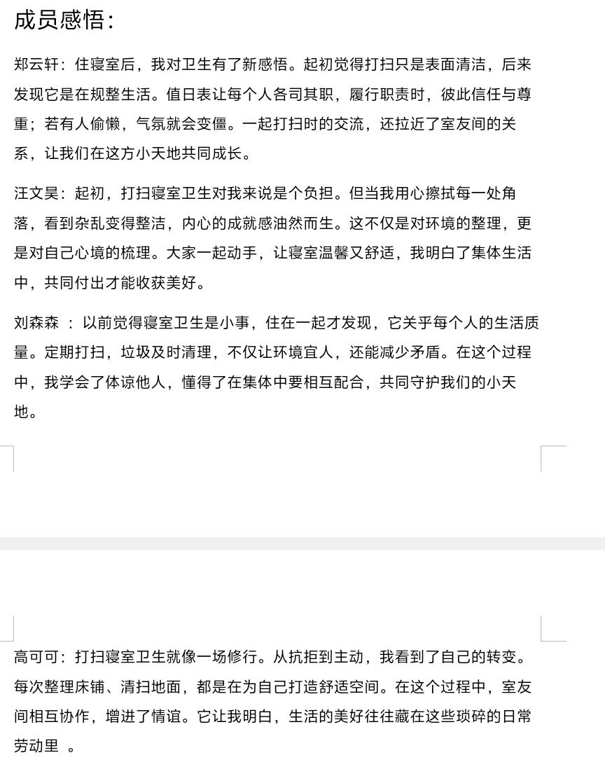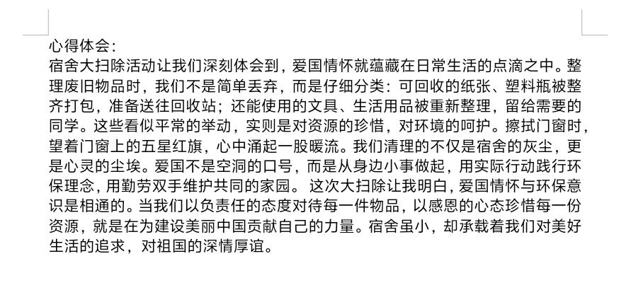 此次爱国卫生运动的成功举办,有效提升了寝室卫生水平,增强了同学们的爱国情怀和环保意识,促进了公司精神文明建设,形成了良好的校园文化氛围。同学们纷纷表示,将以此次活动为契机,持续保持良好的卫生习惯,为打造更美好的校园环境贡献自己的力量。一些同学也发表了自己的感悟。