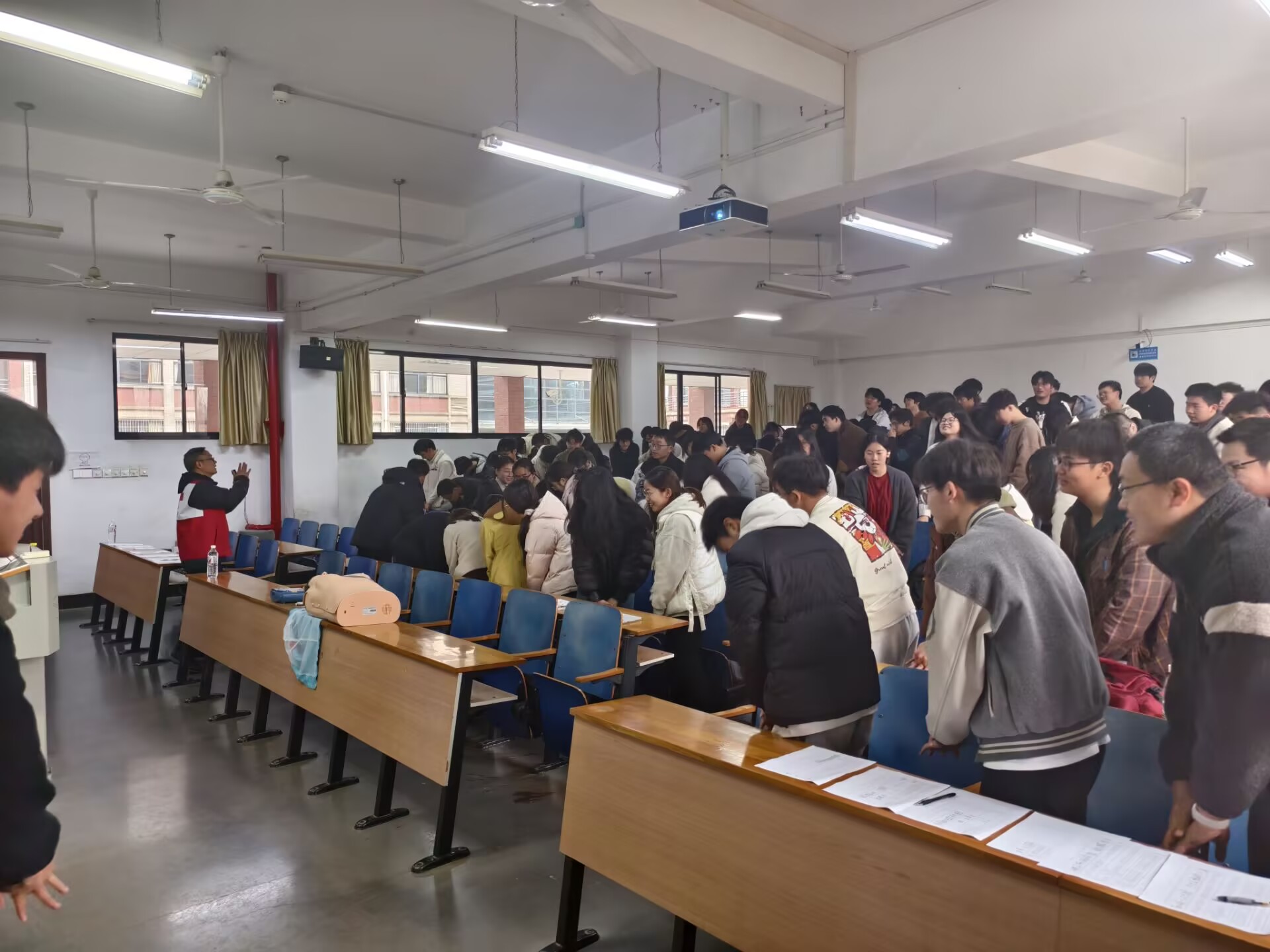 讲座伊始,李伟导师以近期高校突发事件为切入点,通过真实案例的深度剖析,向在场师生揭示了"急救技能缺失可能导致的严重后果",用数据论证了"急救知识应成为现代人必修课"的核心观点。在理论讲解环节,导师创新采用启发式教学法,通过"意识判断三步骤""呼吸观察四要素"等结构化知识模块,配合情景问答的互动形式,引导同学们逐步构建院前评估的完整知识体系。