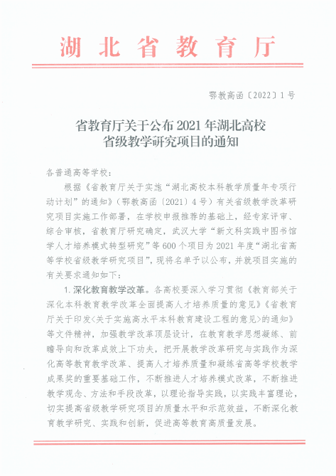此次省教育厅在公司申报推荐的基础上,经专家评审、综合审核、研究后确定,武汉大学"新文科实践中图书馆学人才培养模式转型研究"等600个项目为2021年度"湖北省高等公司省级教学研究项目"。