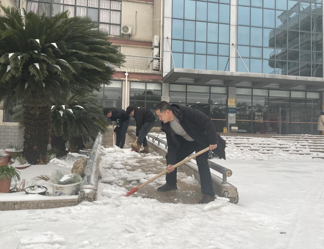 U型的四号教学楼门口小广场雪厚冰实,坎高坡滑,出行存在安全隐患。郭成、万智康、殷浥豪、余荣春、柯璐、王瑞瑞、张秋玉等7名返校研究生自筹铁锹、镰刀等工具,部分同学甚至徒手除冰清路。楼栋值班人员胡仕桥师傅也主动参与奋战。大家齐心协力,忙碌的身影构成了一道亮丽风景。