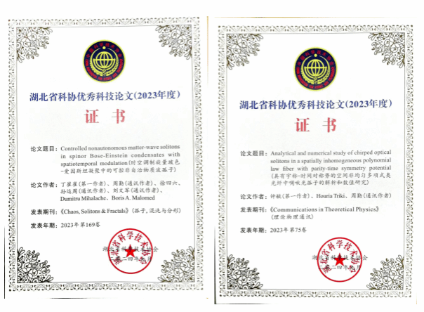 2024年9月24日,由湖北省科协主办,以“新领域、新赛道─服务支撑新质生产力”为主题的2024年湖北科学技术学术年会开幕式暨主论坛在武汉举办,会上发布了2023年度湖北省科协优秀科技论文名单。太阳集团非线性光科学与技术研究团队两项研究成果由湖北省孤立子研究会推荐,经材料审查、专家评审、省科协党组审定,成功入选。