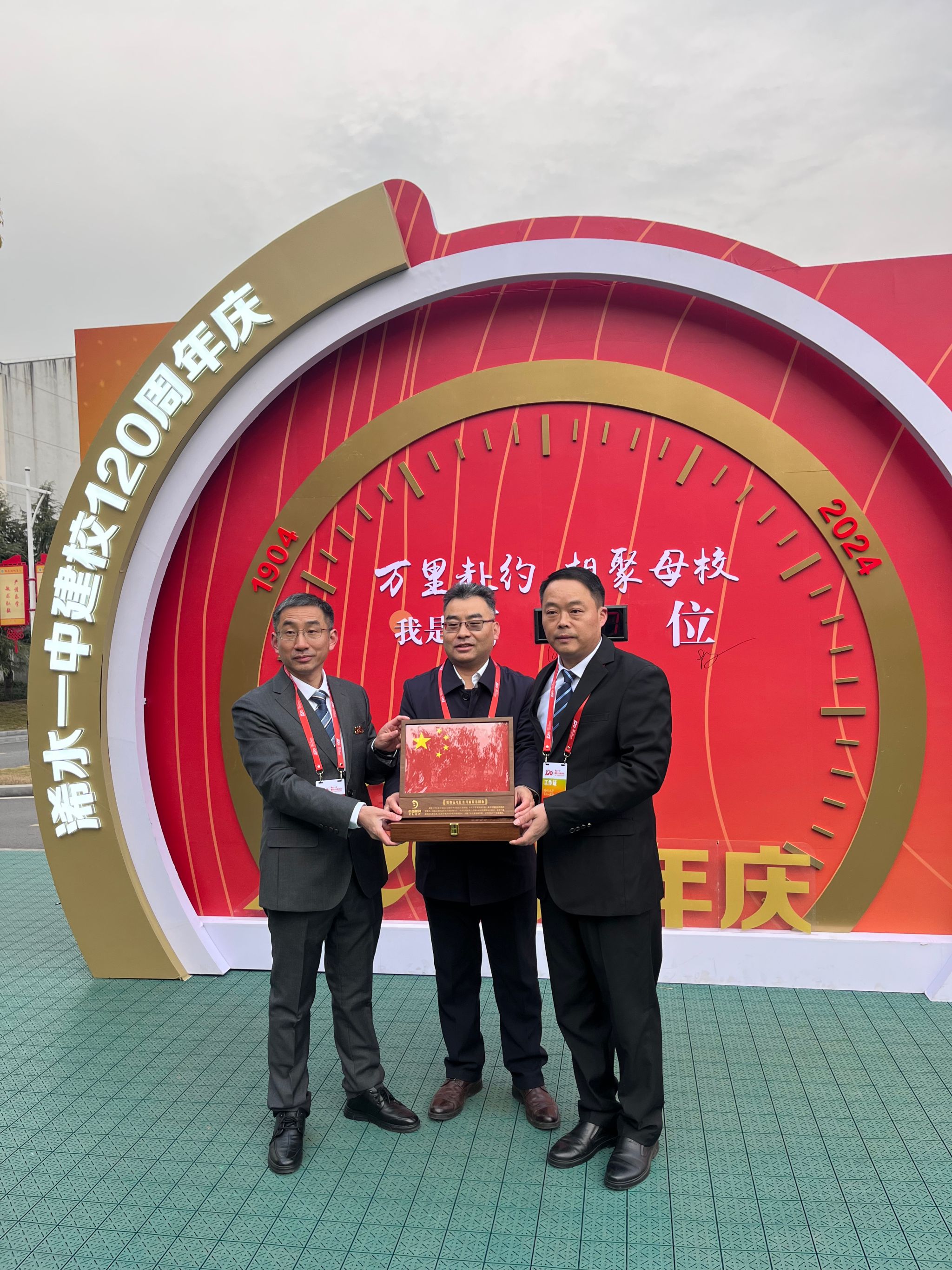 2024年12月22日,15vip太阳集团经理汪胜祥受邀出席浠水县第一中学建校120周年庆典仪式。汪胜祥代表公司赠送“嫦娥五号”月面国旗,浠水一中党委书记周七零、董事长占子龙受赠。