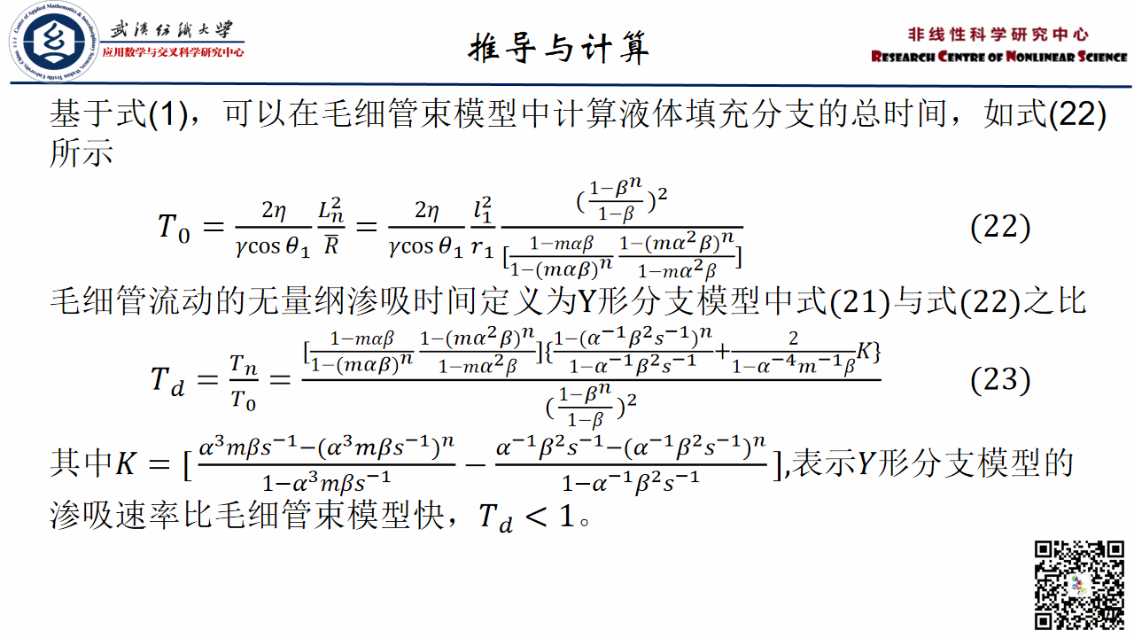 单奥迪:本次组会汇报了一篇名为《Spontaneous Imbibition in a Fractal Network Model with Different Wettabilities》的文献,这篇文章提出了建立考虑润湿性因素的分支模型,采用经典的LW方程对发生在Y形模型中的渗吸过程进行了建模,导出了分支模型中液体流动的无量纲渗吸时间。通过数学模型分析了不同润湿条件下长度比和半径比的影响,以及润湿性变化对渗吸过程的影响。