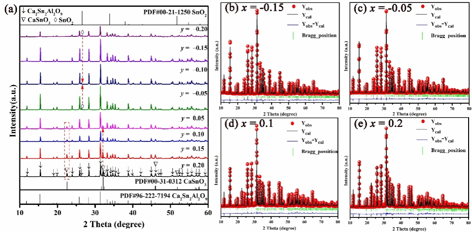 具有低εr和超高Q×f值(>100000GHz)的微波介质材料是科研工作者的重点研究对象,它可以满足高速信号设备的低延迟、超低插入损耗和高热稳定性的要求。硅酸盐和铝酸盐的原料价格低廉,合成微波介质陶瓷的成本较低,且Si-O和Al-O键的低离子性表明其可能具有低εr和高Q×f值,这激发了我们对硅酸盐和铝酸盐的探索。经过长期的实验研究和查阅资料,我们在本次课题中采用非化学计量比的形式,通过调控Ca2Sn2Al2O9陶瓷中Ca和Al元素的含量,抑制了高损耗的第二相,在Ca(2+y)Sn2Al(2+x)O(9+1.5x+y)陶瓷中成功合成了单相Ca2Sn2Al2O9陶瓷,并在Ca2Sn2Al2O9基陶瓷材料中实现了超高的Q×f值。