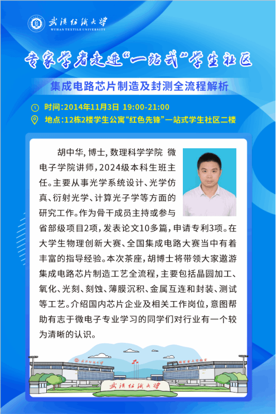 11月3日下午,胡中华博士以《集成电路芯片制造及封测全流程解析》为题,面向微电子专业同学进行宣讲,为同学们打开了知识启蒙的大门。讲座吸引了12栋乃至13栋相关专业的同学踊跃参加。