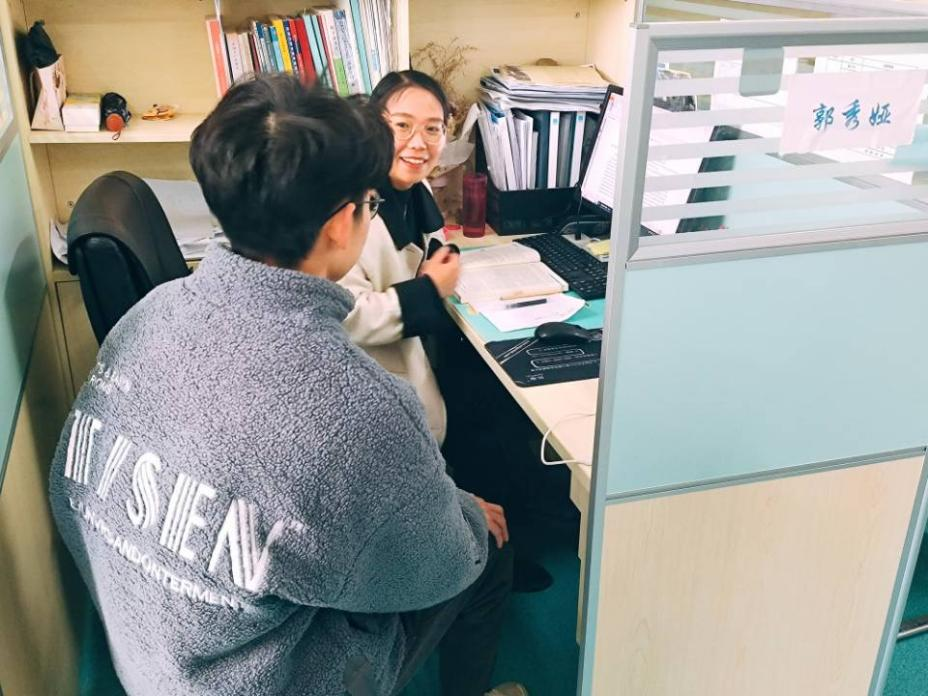 在年龄上,郭秀娅老师作为90后的年轻教师,与同学年龄相仿,就像同学们的知心大姐姐。郭秀娅老师对员工也十分关心,不仅会在学习上与同学们同频道进行答疑,在生活中也和员工们相处的十分融洽和谐。郭秀娅老师说道:“和员工们相处,我总是感到轻松快乐,因为我也很理解这群00后的孩子们,在课堂上我和员工之间没有传统的拘束,在教授知识的过程中,和同学们的互动也十分快乐,我希望孩子们都能在快乐中学习。”在对线性代数和高等数学等公共课进行授课时,即便身处大教室中授课,郭老师也能关注到大多数员工,和员工之间保持着良好的互动。每当班上的同学有问题向老师提出时,郭老师都会耐心的解答。“教子教女,辛勤半辈,与老师亦师亦友”,这是同学们对老师真挚的评价。